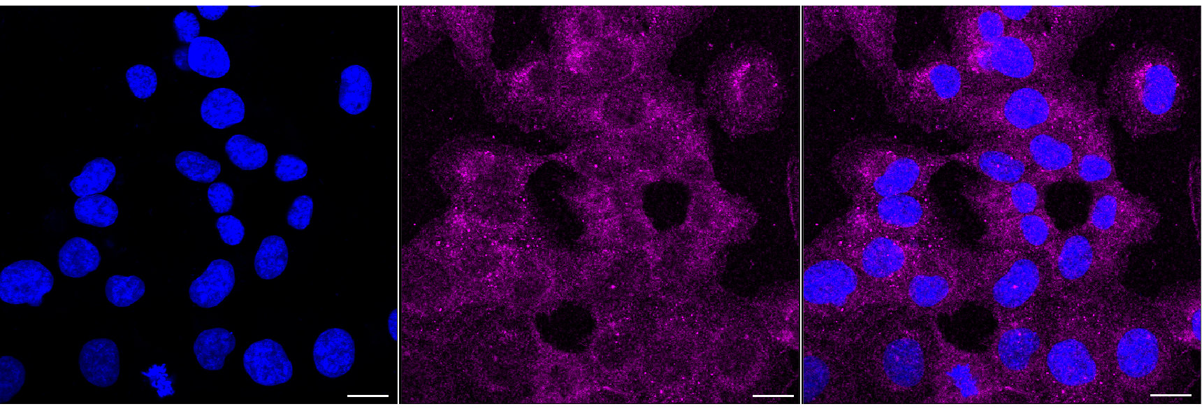 Immunocytochemical staining of HT-1080 cells with MARK2 antibody. Nuclei were stained blue with DAPI; MARK2 was stained magenta with Alexa Fluor? 647. Images were taken using Leica stellaris 5. Protein abundance based on laser Intensity and smart gain: Medium. Scale bar, 20 μm.