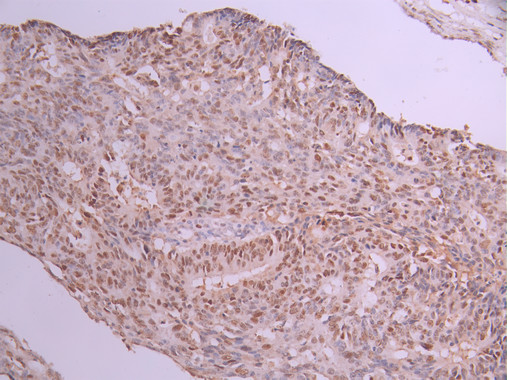 IHC image of CSB-RA261449A0HU diluted at 1:100 and staining in paraffin-embedded human placenta tissue performed on a Leica BondTM system. After dewaxing and hydration, antigen retrieval was mediated by high pressure in a citrate buffer (pH 6.0). Section was blocked with 10% normal goat serum 30min at RT. Then primary antibody (1% BSA) was incubated at 4°C overnight. The primary is detected by a Goat anti-rabbit polymer IgG labeled by HRP and visualized using 0.05% DAB.