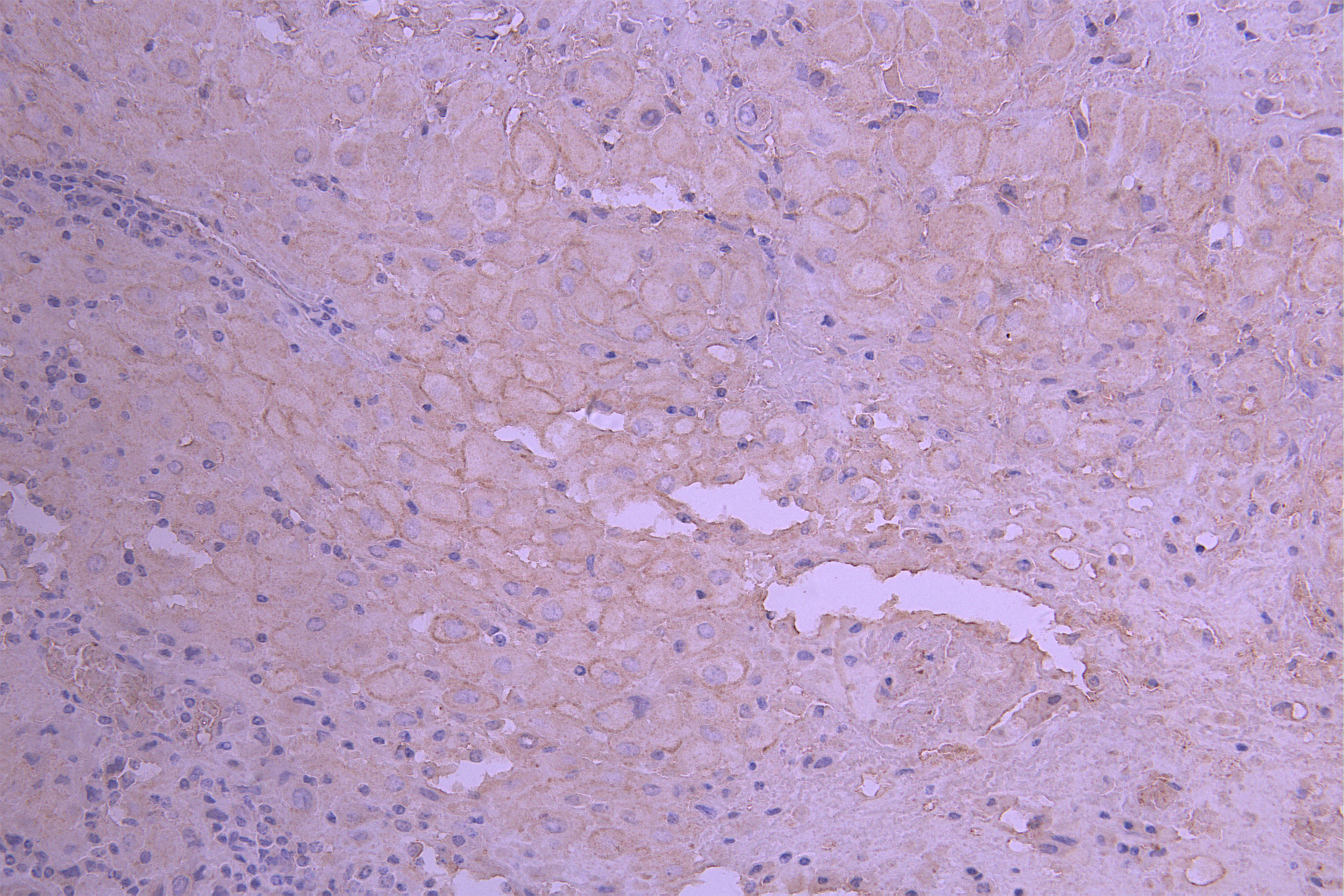 IHC image of CSB-RA014666MA1HU diluted at 1:50 and staining in paraffin-embedded human placenta tissue performed on a Leica BondTM system. After dewaxing and hydration, antigen retrieval was mediated by high pressure in a citrate buffer (pH 6.0). Section was blocked with 10% normal goat serum 30min at RT. Then primary antibody (1% BSA) was incubated at 4°C overnight. The primary is detected by a Anti-Human lgG, Fcy Fragment Specific labeled by HRP and visualized using 0.05% DAB.
