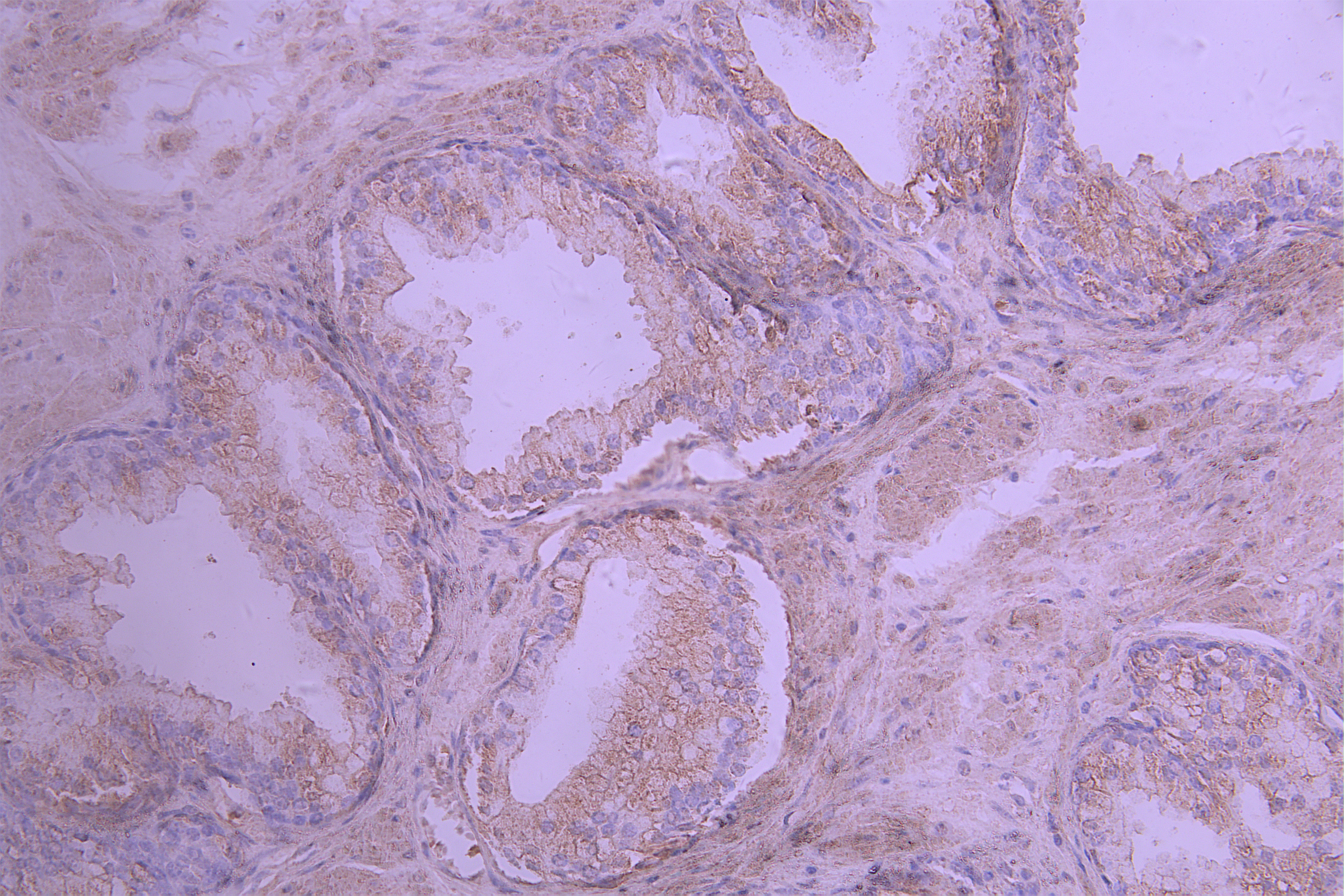 IHC image of CSB-RA014666MA1HU diluted at 1:50 and staining in paraffin-embedded human prostate cancer performed on a Leica BondTM system. After dewaxing and hydration, antigen retrieval was mediated by high pressure in a citrate buffer (pH 6.0). Section was blocked with 10% normal goat serum 30min at RT. Then primary antibody (1% BSA) was incubated at 4°C overnight. The primary is detected by a Anti-Human lgG, Fcy Fragment Specific labeled by HRP and visualized using 0.05% DAB.