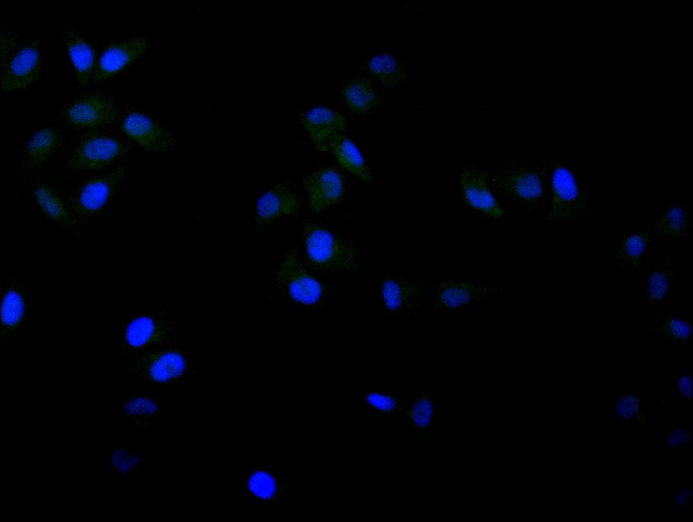 Immunofluorescence staining of Hela cell with CSB-RA219991A0HU at 1:50, counter-stained with DAPI. The cells were fixed in 4% formaldehyde, permeabilized using 0.2% Triton X-100 and blocked in 10% normal Goat Serum. The cells were then incubated with the antibody overnight at 4°C. The secondary antibody was Alexa Fluor 488-congugated AffiniPure Goat Anti-Rabbit IgG(H+L).