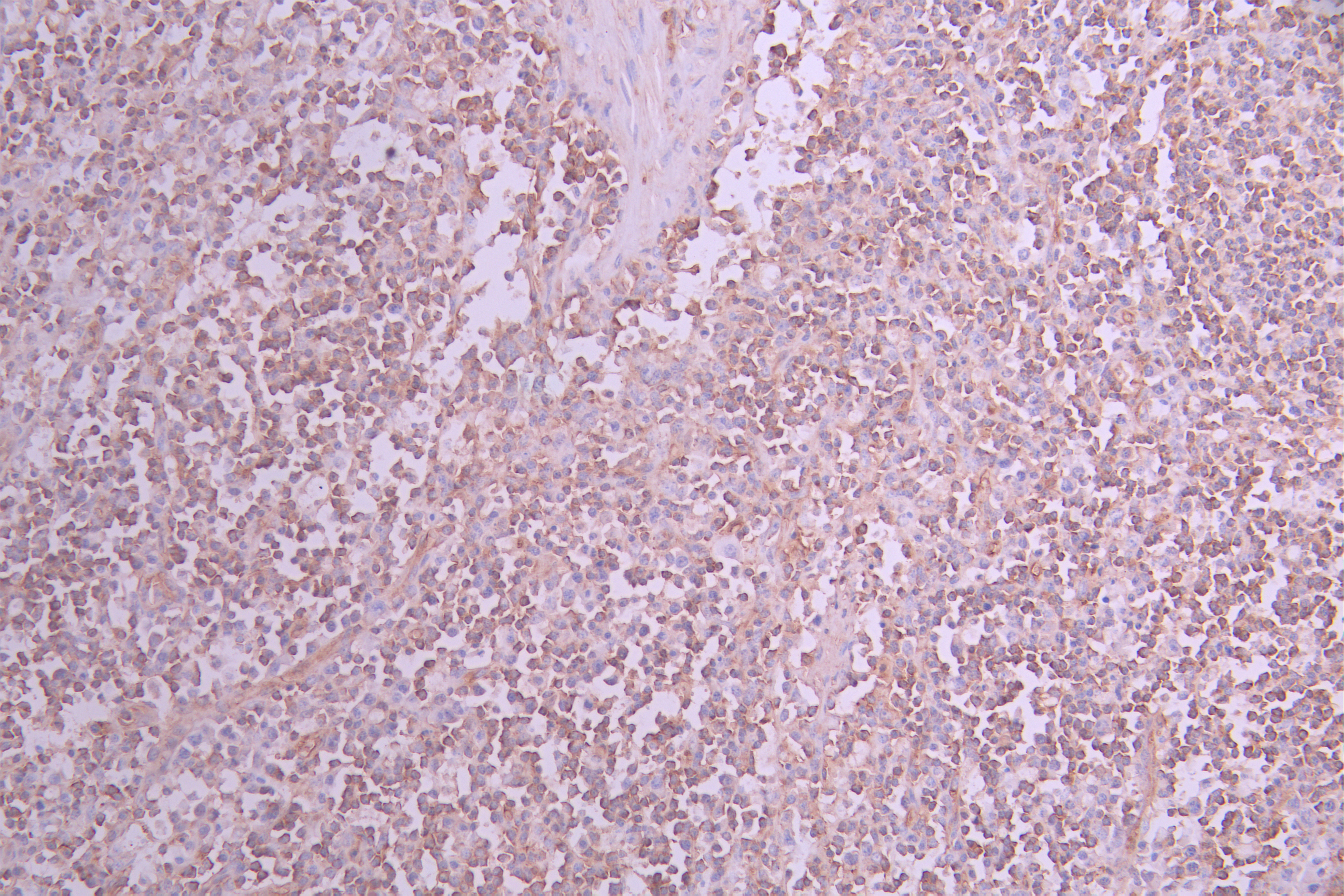 IHC image of CSB-RA257452A0HU diluted at 1:100 and staining in paraffin-embedded human lymph node tissue performed on a Leica BondTM system. After dewaxing and hydration, antigen retrieval was mediated by high pressure in a citrate buffer (pH 6.0). Section was blocked with 10% normal goat serum 30min at RT. Then primary antibody (1% BSA) was incubated at 4°C overnight. The primary is detected by a Goat anti-rabbit polymer IgG labeled by HRP and visualized using 0.05% DAB.