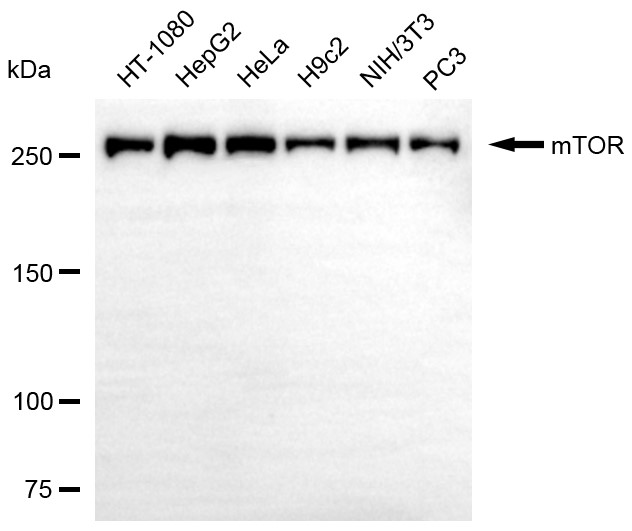 Western blotting analysis using mTOR antibody. Total cell lysates (30 μg) from various cell lines were loaded and separated by SDS-PAGE. The blot was incubated with mTOR antibody and HRP-conjugated goat anti-rabbit secondary antibody respectively.