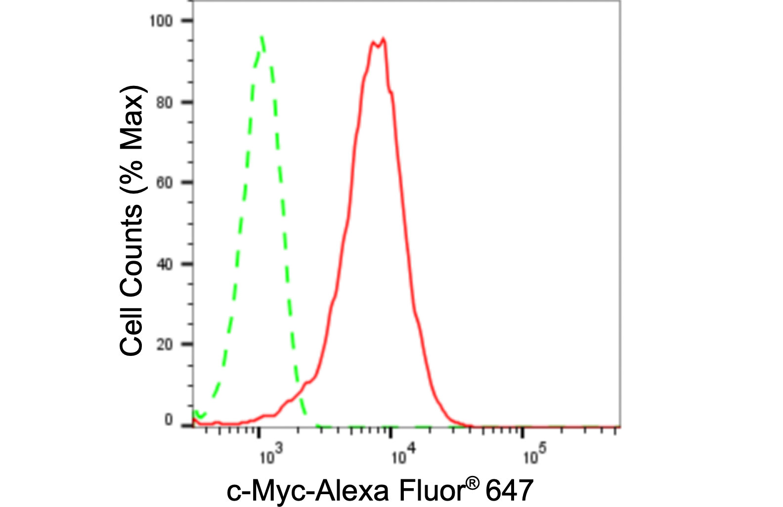 Flow cytometric analysis of c-Myc expression in HepG2 cells using c-Myc antibody. Green, isotype control; red, c-Myc.