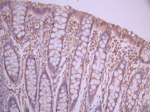 IHC image of CSB-RA246457A0HU diluted at 1:100 and staining in paraffin-embedded human small intestine tissue performed on a Leica BondTM system. After dewaxing and hydration, antigen retrieval was mediated by high pressure in a citrate buffer (pH 6.0). Section was blocked with 10% normal goat serum 30min at RT. Then primary antibody (1% BSA) was incubated at 4°C overnight. The primary is detected by a Goat anti-rabbit polymer IgG labeled by HRP and visualized using 0.05% DAB.