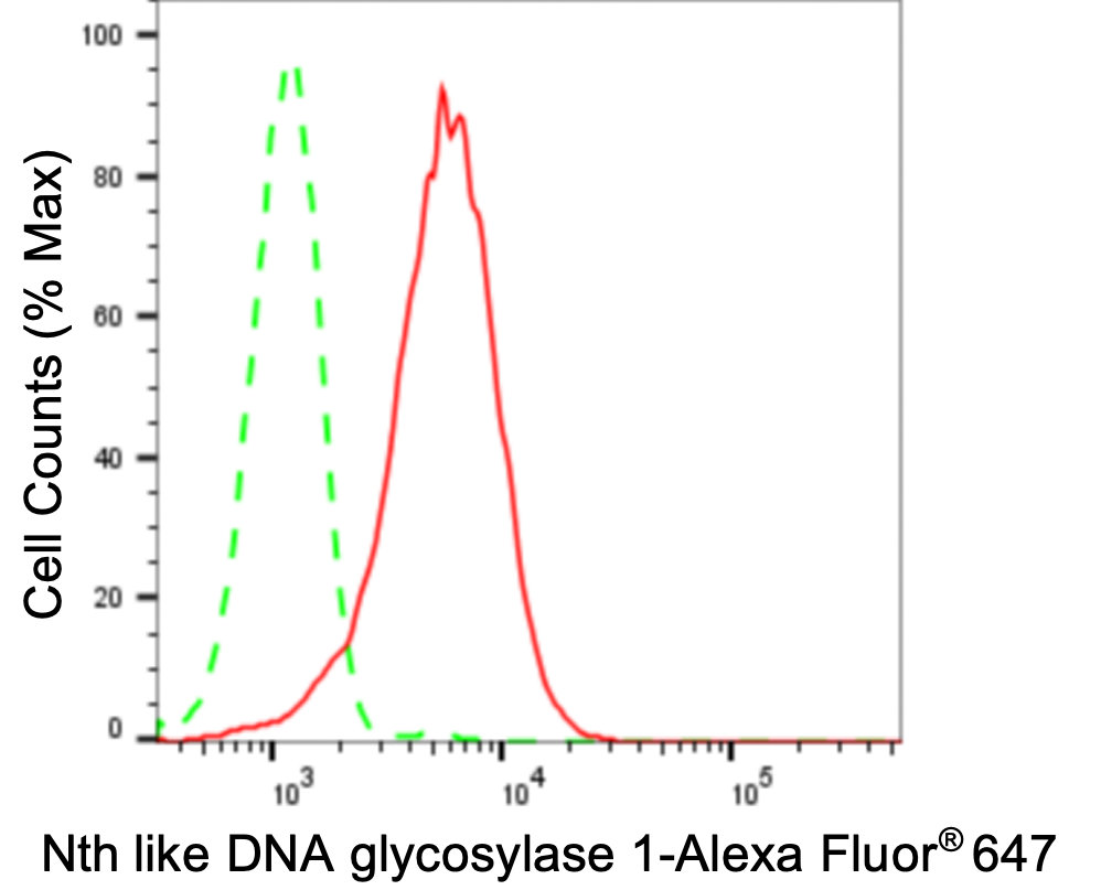 Flow cytometric analysis of Nth like DNA glycosylase 1 expression in HepG2 cells using Nth like DNA glycosylase 1c antibody. Green, isotype control; red, Nth like DNA glycosylase 1.