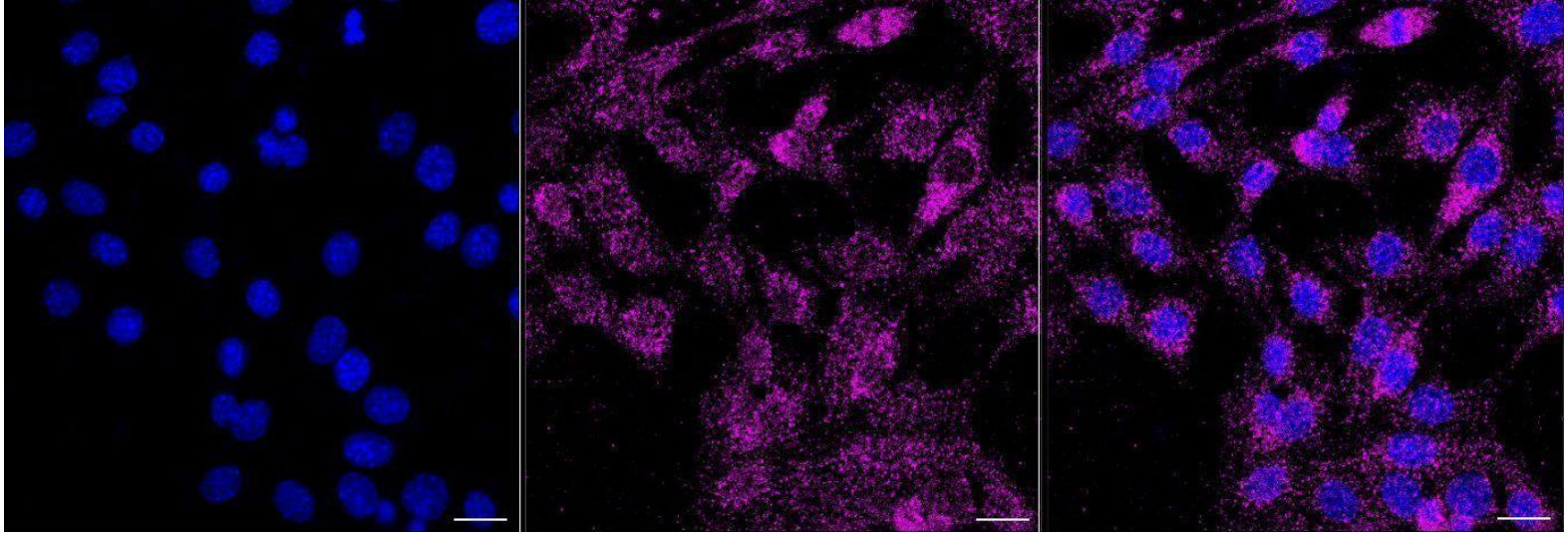 Immunocytochemical staining of C2C12 cells with PI3 Kinase p85 alpha antibody. Nuclei were stained blue with DAPI; PI3 Kinase p85 alpha was stained magenta with Alexa Fluor? 647. Images were taken using Leica stellaris 5. Protein abundance based on laser Intensity and smart gain: Medium. Scale bar, 20 μm.