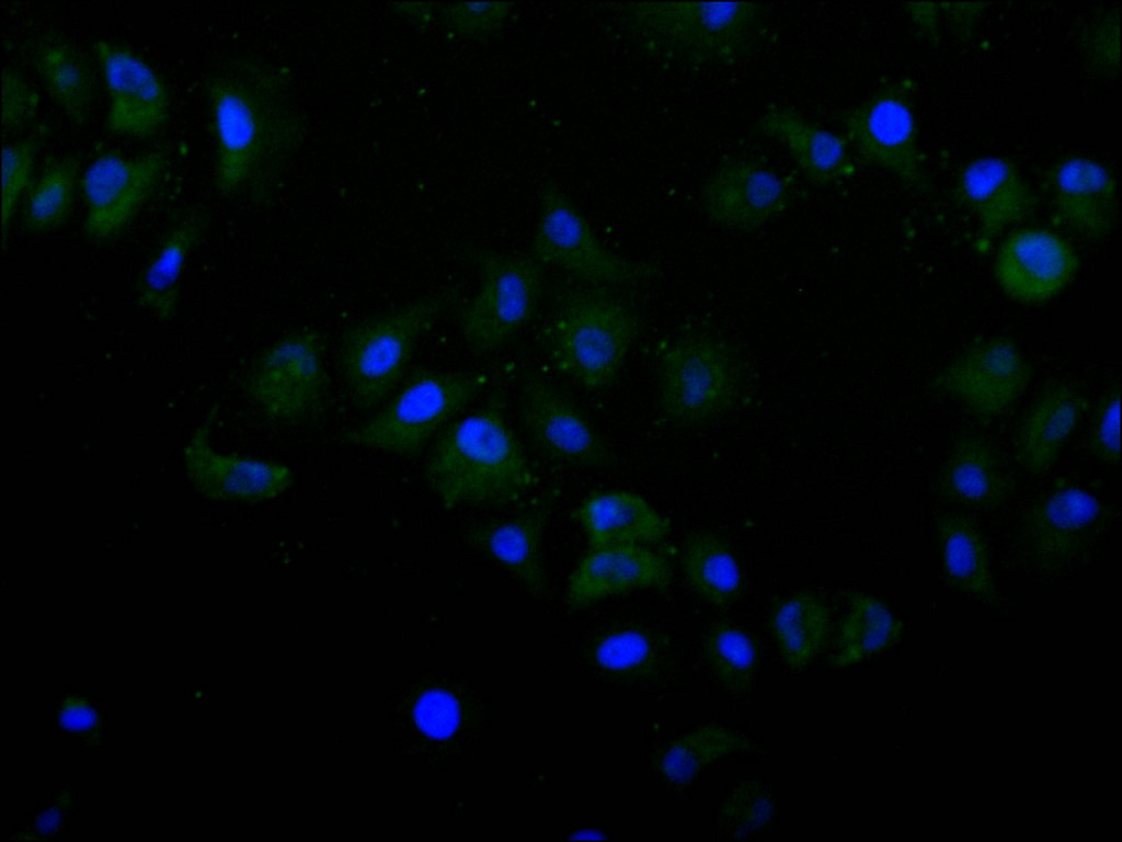 Immunofluorescence staining of Hela cell with CSB-RA565057A0HU at 1:50, counter-stained with DAPI. The cells were fixed in 4% formaldehyde, permeabilized using 0.2% Triton X-100 and blocked in 10% normal Goat Serum. The cells were then incubated with the antibody overnight at 4°C. The secondary antibody was Alexa Fluor 488-congugated AffiniPure Goat Anti-Rabbit IgG(H+L).