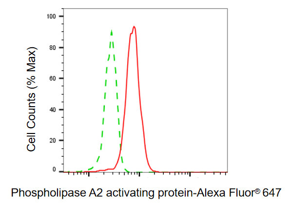 Flow cytometric analysis of phospholipase A2 activating protein expression in HepG2 cells using phospholipase A2 activating protein antibody. Green, isotype control; red, phospholipase A2 activating protein.