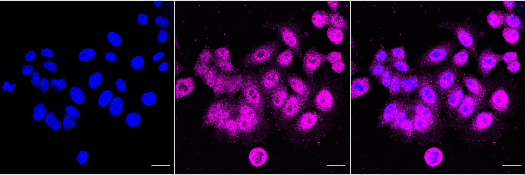 Immunocytochemical staining of HepG2 cells with Phospholipase A2 activating protein antibody. Nuclei were stained blue with DAPI; Phospholipase A2 activating protein was stained magenta with Alexa Fluor? 647. Images were taken using Leica stellaris 5. Protein abundance based on laser Intensity and smart gain: Medium. Scale bar, 20 μm.