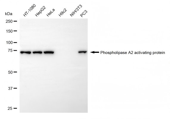 Western blotting analysis using phospholipase A2 activating protein antibody. Total cell lysates (30 μg) from various cell lines were loaded and separated by SDS-PAGE. The blot was incubated with phospholipase A2 activating protein antibody and HRP-conjugated goat anti-rabbit secondary antibody respectively.
