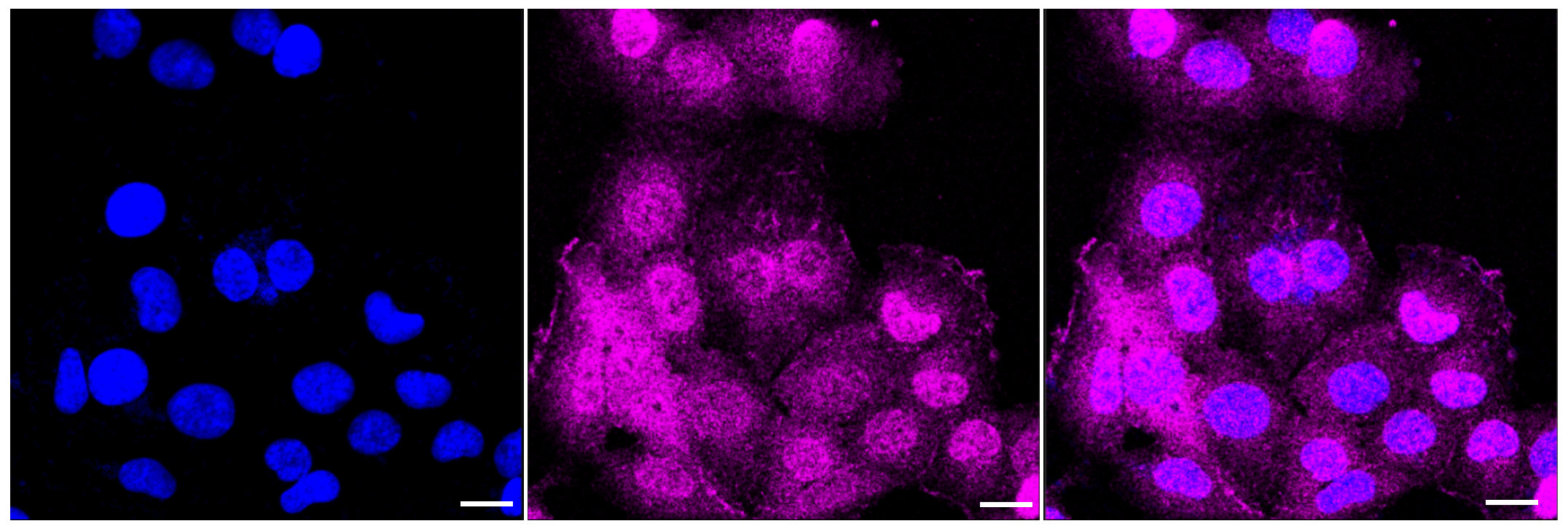 Immunocytochemical staining of HT-1080 cells with Phospholipase C gamma 1 antibody. Nuclei were stained blue with DAPI; Phospholipase C gamma 1 was stained magenta with Alexa Fluor? 647. Images were taken using Leica stellaris 5. Protein abundance based on laser Intensity and smart gain: Medium. Scale bar: 20 μm.