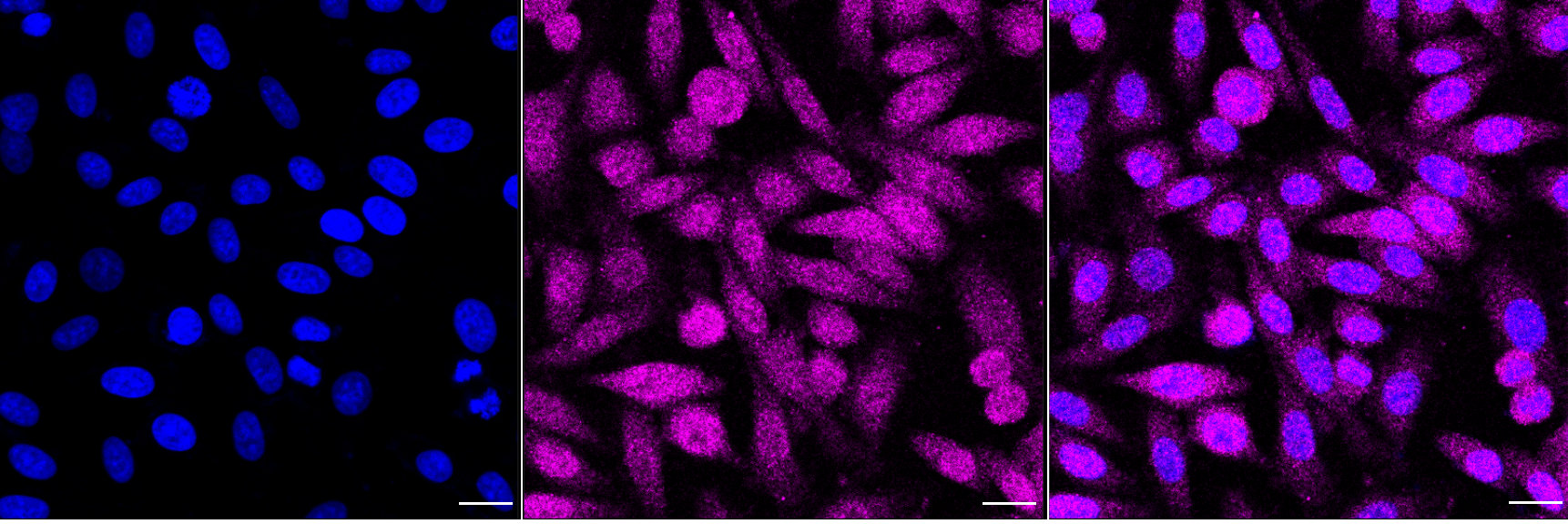 Immunocytochemical staining of HepG2 cells with Phospholipase C gamma 1 antibody. Nuclei were stained blue with DAPI; Phospholipase C gamma 1 was stained magenta with Alexa Fluor? 647. Images were taken using Leica stellaris 5. Protein abundance based on laser Intensity and smart gain: Medium. Scale bar, 20 μm.
