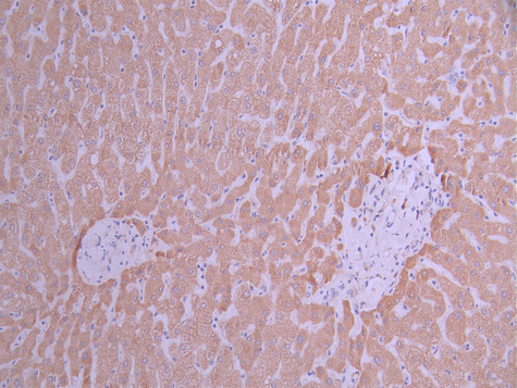 IHC image of CSB-RA976601A0HU diluted at 1:100 and staining in paraffin-embedded human liver tissue performed on a Leica BondTM system. After dewaxing and hydration, antigen retrieval was mediated by high pressure in a citrate buffer (pH 6.0). Section was blocked with 10% normal goat serum 30min at RT. Then primary antibody (1% BSA) was incubated at 4°C overnight. The primary is detected by a Goat anti-rabbit polymer IgG labeled by HRP and visualized using 0.05% DAB.