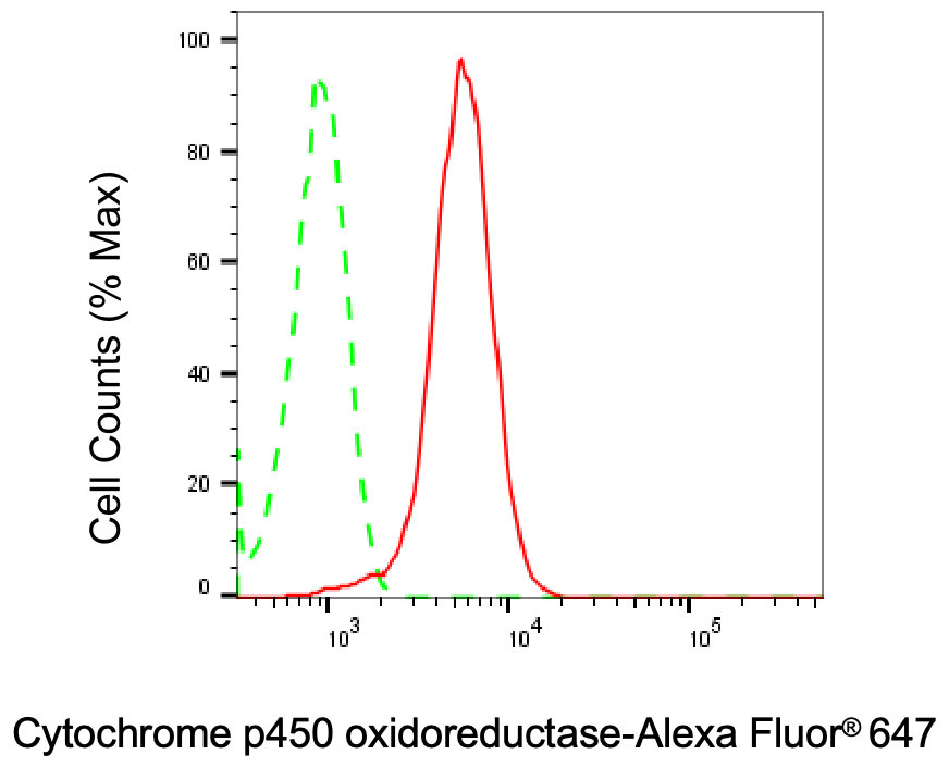 Flow cytometric analysis of Cytochrome p450 oxidoreductase expression in HepG2 cells using Cytochrome p450 oxidoreductase antibody. Green, isotype control; red, Cytochrome p450 oxidoreductase.