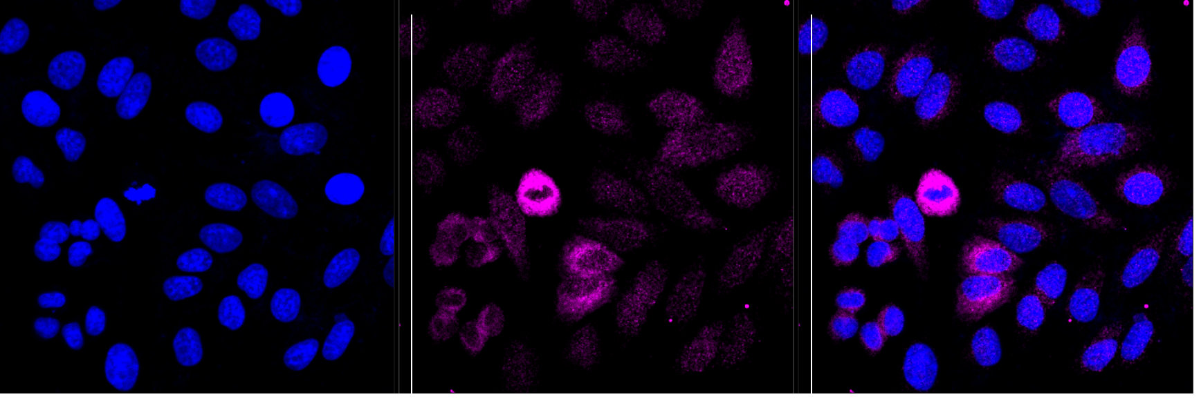 Immunocytochemical staining of HepG2 cells with Cytochrome p450 oxidoreductase antibody. Nuclei were stained blue with DAPI; Cytochrome p450 oxidoreductase was stained magenta with Alexa Fluor? 647. Images were taken using Leica stellaris 5. Protein abundance based on laser Intensity and smart gain: Medium. Scale bar, 20 μm.