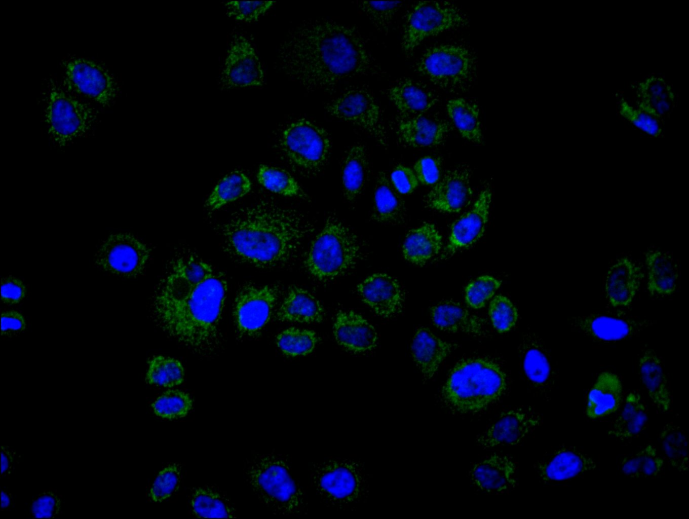 • Immunofluorescence staining of Hela cell with CSB-RA018656MA1HU at 1:30 ,counter-stained with DAPI. The cells were fixed in 4% formaldehyde, permeabilized using 0.2% Triton X-100 and blocked in 10% normal Goat Serum. The cells were then incubated with the antibody overnight at 4°C. The secondary antibody was Fluorescein (FITC) AffiniPure Goat Anti-Human IgG, Fcγ fragment specific.