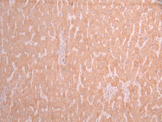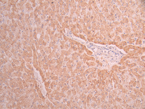 • IHC image of CSB-RA018656MA1HU diluted at 1:50 and staining in paraffin-embedded human liver tissue performed on a Leica BondTM system. After dewaxing and hydration, antigen retrieval was mediated by high pressure in a citrate buffer (pH 6.0). Section was blocked with 10% normal goat serum 30min at RT. Then primary antibody (1% BSA) was incubated at 4°C overnight. The primary is detected by a Anti-Human lgG, Fcy Fragment Specific labeled by HRP and visualized using 0.05% DAB.