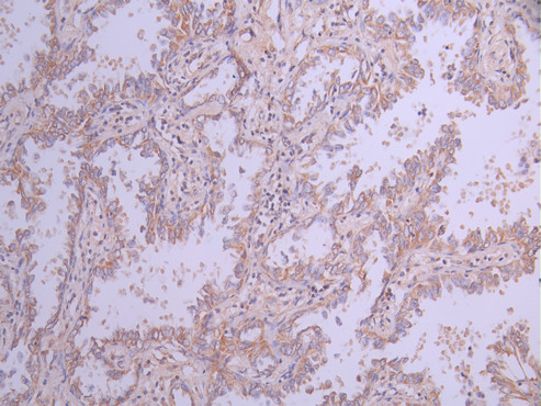 • IHC image of CSB-RA018656MA1HU diluted at 1:50 and staining in paraffin-embedded human lung cancer performed on a Leica BondTM system. After dewaxing and hydration, antigen retrieval was mediated by high pressure in a citrate buffer (pH 6.0). Section was blocked with 10% normal goat serum 30min at RT. Then primary antibody (1% BSA) was incubated at 4°C overnight. The primary is detected by a Anti-Human lgG, Fcy Fragment Specific labeled by HRP and visualized using 0.05% DAB.