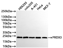 Positive WB detected in: HEK293 whole cell lysate(30μg), colo205 whole cell lysate(30μg), A-431 whole cell lysate(30μg), Hela whole cell lysate(30μg), MCF-7 whole cell lysate(30μg)