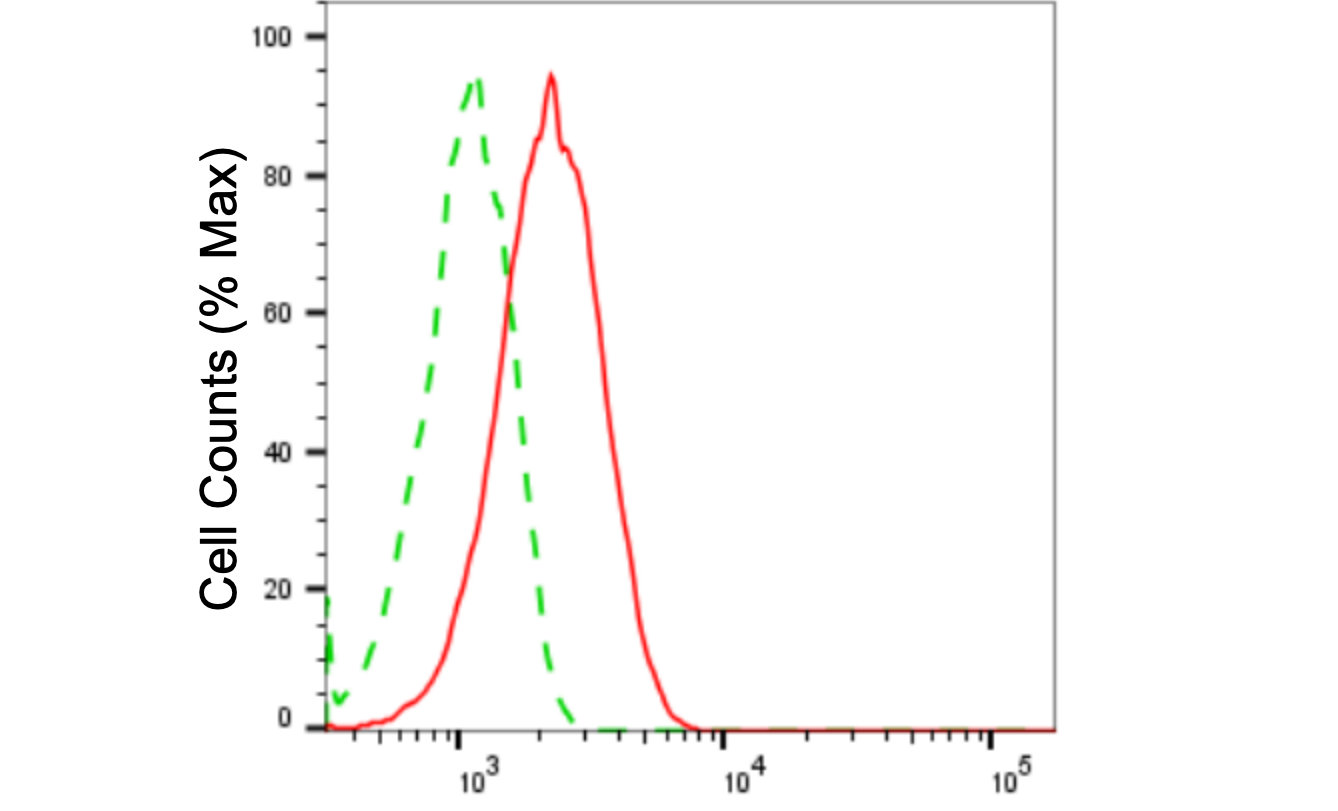 Flow cytometric analysis of CD133 expression in HAP-1 cells using CD133 antibody. Green, isotype control; red, CD133.
