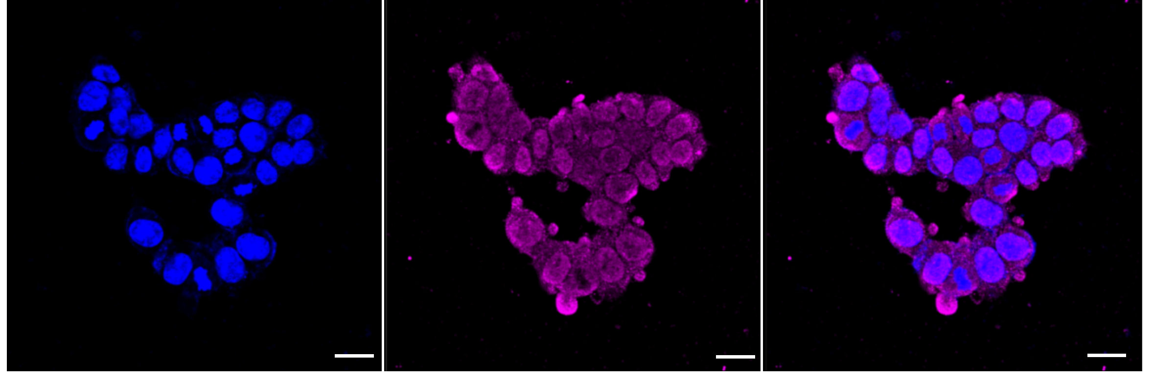 Immunocytochemical staining of HAP-1 cells with CD133 antibody. Nuclei were stained blue with DAPI; CD133 was stained magenta with Alexa Fluor? 647. Images were taken using Leica stellaris 5. Protein abundance based on laser Intensity and smart gain: Medium. Scale bar: 20 μm.