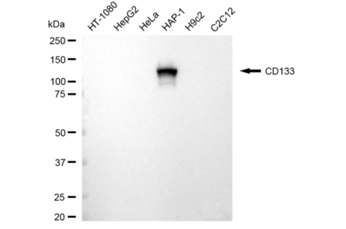 Western blotting analysis using CD133 antibody. Total cell lysates (30 μg) from various cell lines were loaded and separated by SDS-PAGE. The blot was incubated with CD133 antibody and HRP-conjugated goat anti-rabbit secondary antibody respectively.