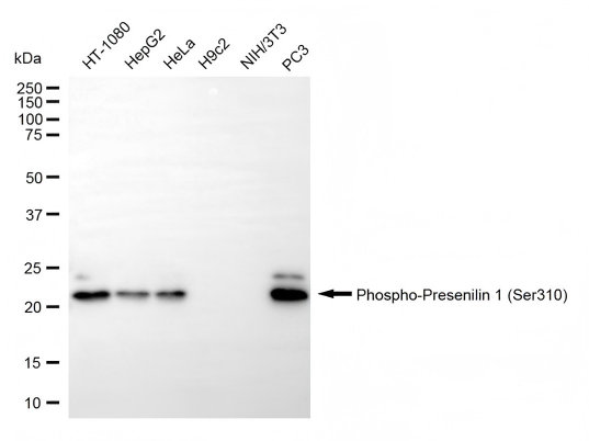 Western blotting analysis using phospho-presenilin 1 (Ser310) antibody. Total cell lysates (30 μg) from various cell lines were loaded and separated by SDS-PAGE. The blot was incubated with phospho-presenilin 1 (Ser310) antibody and HRP-conjugated goat anti-rabbit secondary antibody respectively.
