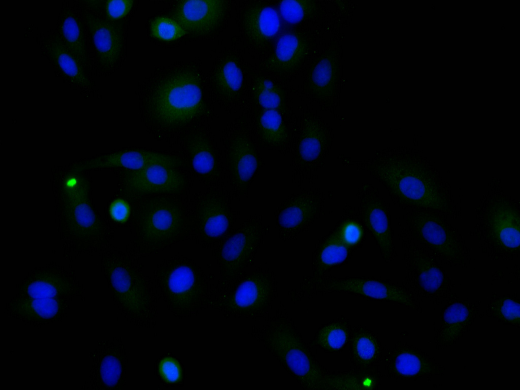 Immunofluorescence staining of A549 cell with CSB-RA585042A0HU at 1:50 , counter-stained with DAPI. The cells were fixed in 4% formaldehyde, permeabilized using 0.2% Triton X-100 and blocked in 10% normal Goat Serum. The cells were then incubated with the antibody overnight at 4°C. The secondary antibody was Alexa Fluor 488-congugated AffiniPure Goat Anti-Rabbit IgG(H+L).