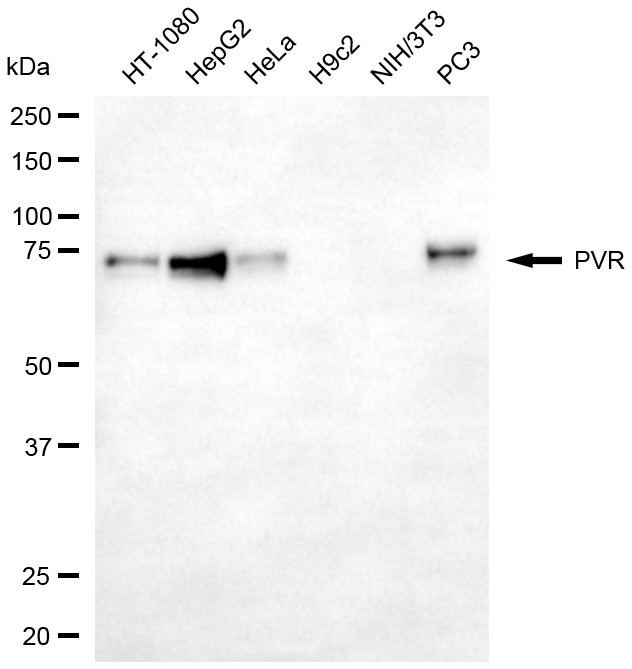 • Western blotting analysis using PVR antibody. Total cell lysates (30 μg) from various cell lines were loaded and separated by SDS-PAGE. The blot was incubated with PVR antibody and HRP-conjugated goat anti-rabbit secondary antibody respectively.
