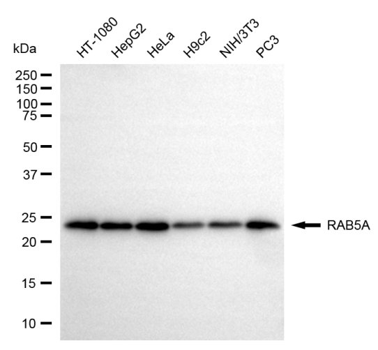 Western blotting analysis using RAB5A antibody. Total cell lysates (30 μg) from various cell lines were loaded and separated by SDS-PAGE. The blot was incubated with RAB5A antibody and HRP-conjugated goat anti-rabbit secondary antibody respectively.