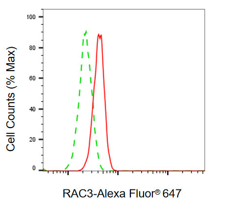 Flow cytometric analysis of RAC3 expression in HSHC cells using RAC3 antibody. Green, isotype control; red, RAC3.