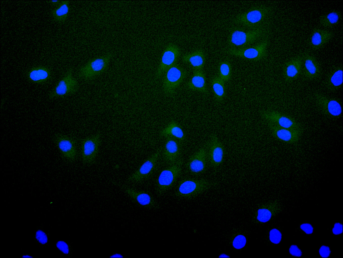 • Immunofluorescence staining of Hela cell with CSB-RA019260MA1HU at 1:30 ,counter-stained with DAPI. The cells were fixed in 4% formaldehyde, permeabilized using 0.2% Triton X-100 and blocked in 10% normal Goat Serum. The cells were then incubated with the antibody overnight at 4°C. The secondary antibody was Fluorescein (FITC) AffiniPure Goat Anti-Human IgG, Fcγ fragment specific.