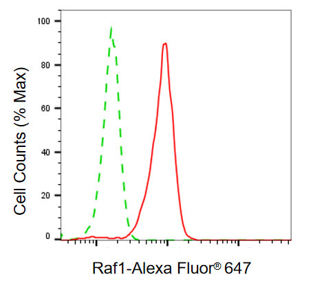 Flow cytometric analysis of Raf1 expression in HeLa cells using Raf1 antibody. Green, isotype control; red, Raf1.
