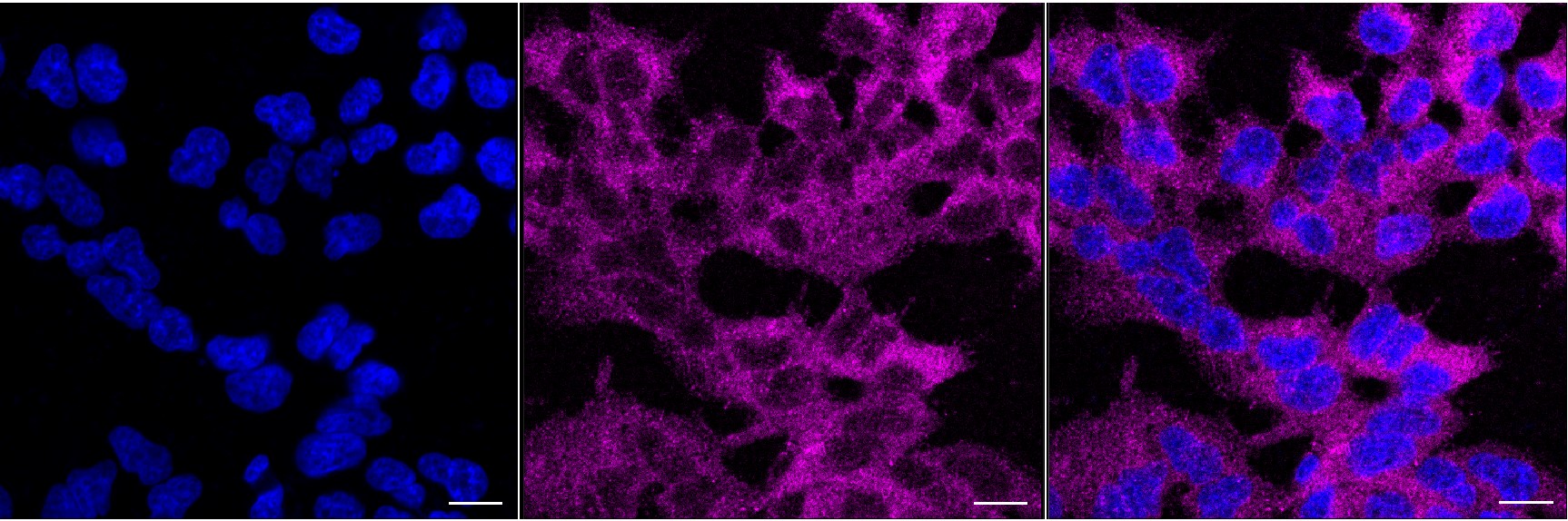 Immunocytochemical staining of HeLa cells with RAF1 antibody. Nuclei were stained blue with DAPI; RAF1 was stained magenta with Alexa Fluor? 647. Images were taken using Leica stellaris 5. Protein abundance based on laser Intensity and smart gain: Medium. Scale bar, 20 μm.