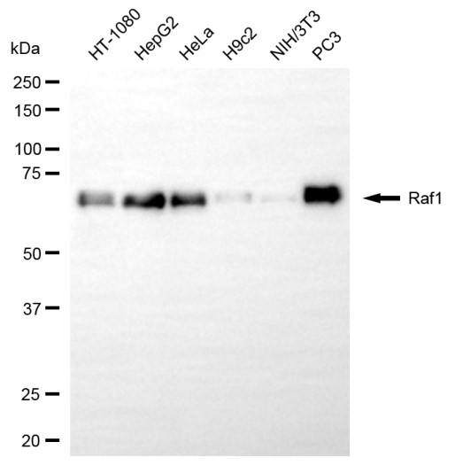 Western blotting analysis using Raf1 antibody. Total cell lysates (30 μg) from various cell lines were loaded and separated by SDS-PAGE. The blot was incubated with Raf1 antibody and HRP-conjugated goat anti-rabbit secondary antibody respectively.