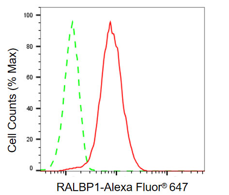 Flow cytometric analysis of RALBP1 expression in HeLa cells using RALBP1 antibody. Green, isotype control; red, RALBP1.