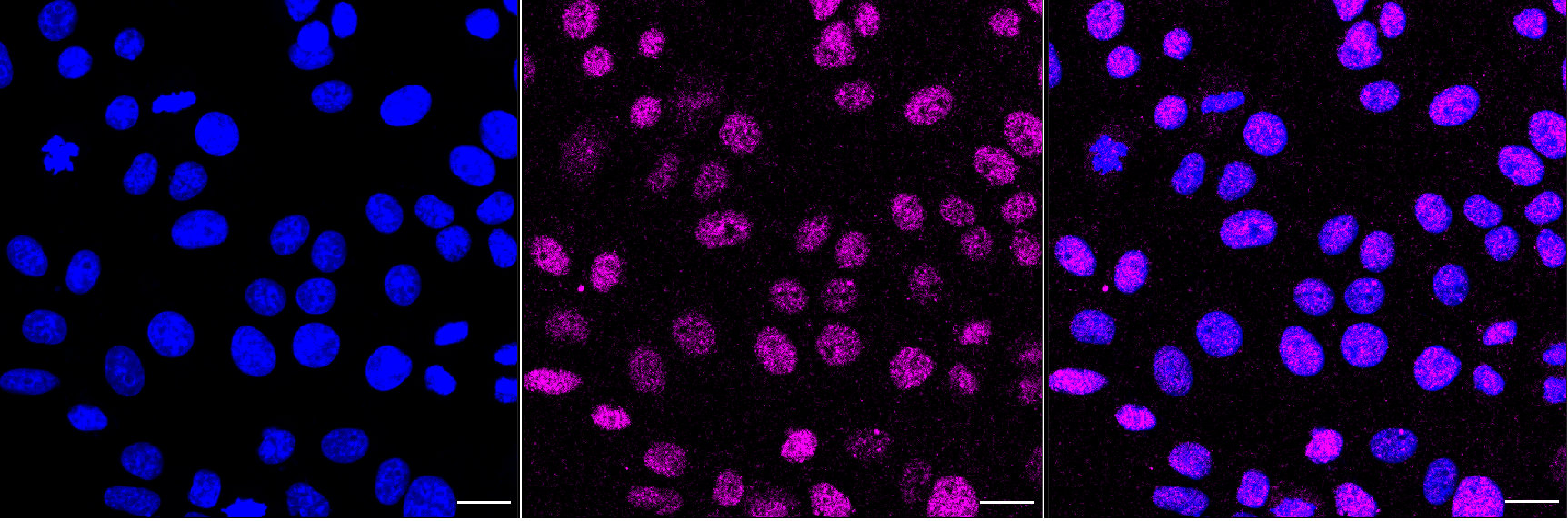 Immunocytochemical staining of HepG2 cells with RING1 antibody. Nuclei were stained blue with DAPI; RING1 was stained magenta with Alexa Fluor? 647. Images were taken using Leica stellaris 5. Protein abundance based on laser Intensity and smart gain: Medium. Scale bar, 20 μm.