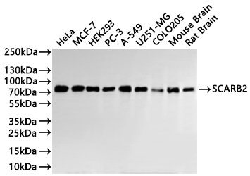 別名:85 kDa lysosomal membrane sialoglycoprotein antibody; 85 kDa lysosomal sialoglycoprotein scavenger receptor class B member 2 antibody; AMRF antibody; CD36 antibody; CD36 antigen (collagen type I receptor; thrombospondin receptor)-like 2 (lysosomal integral membrane protein II) antibody; CD36 antigen antibody; CD36 antigen-like 2 antibody; CD36L2 antibody; EPM4 antibody; HLGP85 antibody; LGP85 antibody; LIMP 2 antibody; LIMP II antibody; LIMP2 antibody; LIMPII antibody; Lysosomal integral membrane protein II antibody; Lysosome membrane protein 2 antibody; Lysosome membrane protein II antibody; OTTHUMP00000160590 antibody; OTTHUMP00000219176 antibody; Scarb2 antibody; Scavenger receptor class B member 2 antibody; Scavenger receptor class B; member 2 antibody; SCRB2_HUMAN antibody; SR BII antibody; SRBII antibody