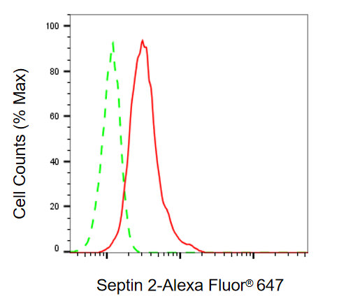 Flow cytometric analysis of septin 2 expression in C2C12 cells using septin 2 antibody. Green, isotype control; red, septin 2.