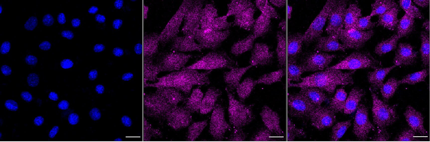 Immunocytochemical staining of C2C12 cells with septin 2 antibody. Nuclei were stained blue with DAPI; Septin 2 was stained magenta with Alexa Fluor? 647. Images were taken using Leica stellaris 5. Protein abundance based on laser Intensity and smart gain: Medium. Scale bar, 20 μm.