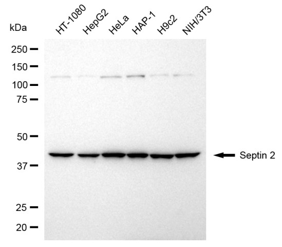 Western blotting analysis using septin 2 antibody. Total cell lysates (30 μg) from various cell lines were loaded and separated by SDS-PAGE. The blot was incubated with septin 2 antibody and HRP-conjugated goat anti-rabbit secondary antibody respectively.