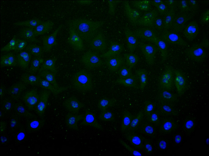 Immunofluorescence staining of Hela cell with CSB-RA021189MA1HU at 1:30 ,counter-stained with DAPI. The cells were fixed in 4% formaldehyde, permeabilized using 0.2% Triton X-100 and blocked in 10% normal Goat Serum. The cells were then incubated with the antibody overnight at 4°C. The secondary antibody was Alexa Fluor 488-congugated AffiniPure Goat Anti-Human IgG(H+L).