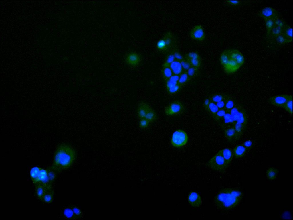 Immunofluorescence staining of HepG2 cell with CSB-RA021189MA1HU at 1:30 ,counter-stained with DAPI. The cells were fixed in 4% formaldehyde, permeabilized using 0.2% Triton X-100 and blocked in 10% normal Goat Serum. The cells were then incubated with the antibody overnight at 4°C. The secondary antibody was Alexa Fluor 488-congugated AffiniPure Goat Anti-Human IgG(H+L).