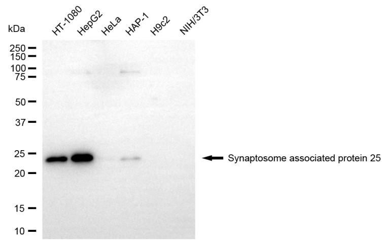 Western blotting analysis using synaptosome associated protein 25 antibody. Total cell lysates (30 μg) from various cell lines were loaded and separated by SDS-PAGE. The blot was incubated with synaptosome associated protein 25 antibody and HRP-conjugated goat anti-rabbit secondary antibody respectively.