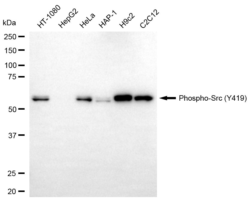 Western blotting analysis using phospho-Src (Y419) antibody. Total cell lysates (30 μg) from various cell lines were loaded and separated by SDS-PAGE. The blot was incubated with phospho-Src (Y419) antibody and HRP-conjugated goat anti-rabbit secondary antibody respectively.