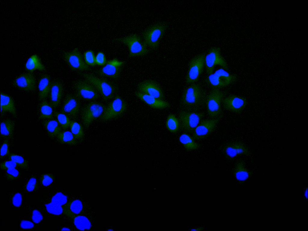 Immunofluorescence staining of Hela cell with CSB-RA944215A0HU at 1:50 , counter-stained with DAPI. The cells were fixed in 4% formaldehyde, permeabilized using 0.2% Triton X-100 and blocked in 10% normal Goat Serum. The cells were then incubated with the antibody overnight at 4°C. The secondary antibody was Alexa Fluor 488-congugated AffiniPure Goat Anti-Rabbit IgG(H+L).