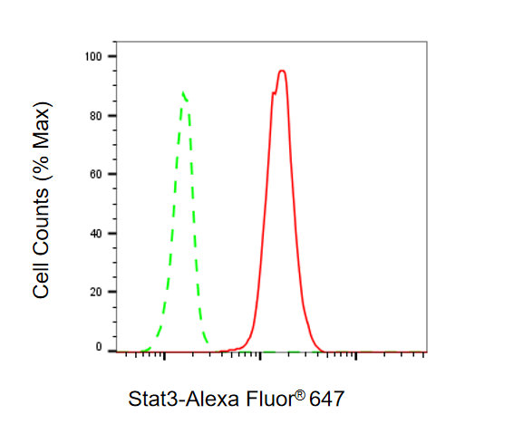 Flow cytometric analysis of Stat3 expression in C2C12 cells using Stat3 antibody. Green, isotype control; red, Stat3.