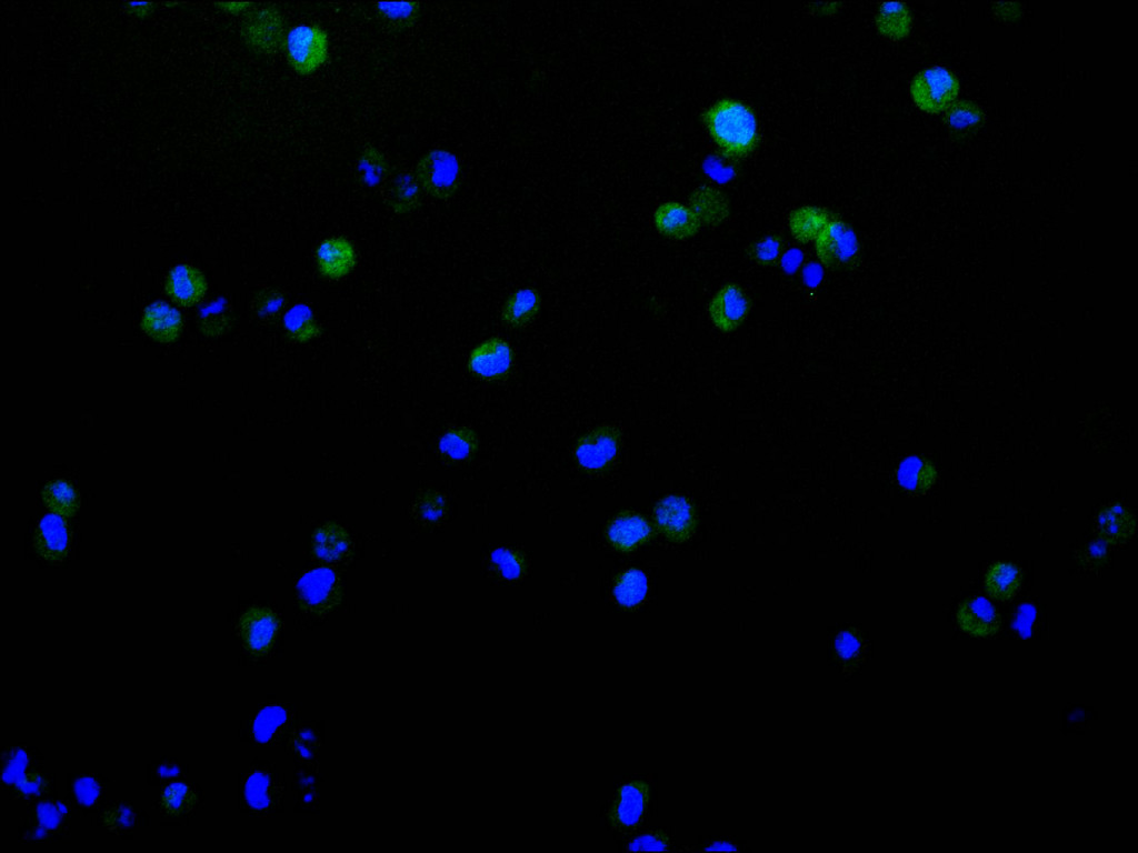 • Immunofluorescence staining of K562 cell with CSB-RA074422A0HU at 1:50, counter-stained with DAPI. The cells were fixed in 4% formaldehyde, permeabilized using 0.2% Triton X-100 and blocked in 10% normal Goat Serum. The cells were then incubated with the antibody overnight at 4°C. The secondary antibody was Alexa Fluor 488-congugated AffiniPure Goat Anti-Rabbit IgG(H+L).