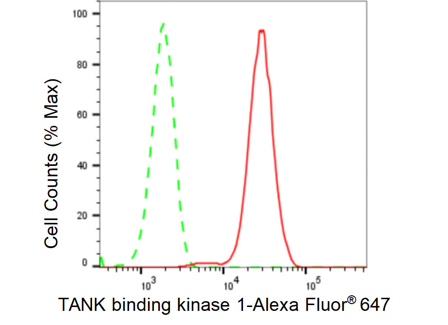 Flow cytometric analysis of TANK binding kinase 1 expression in HepG2 cells using TANK binding kinase 1 antibody. Green, isotype control; red, TANK binding kinase 1.